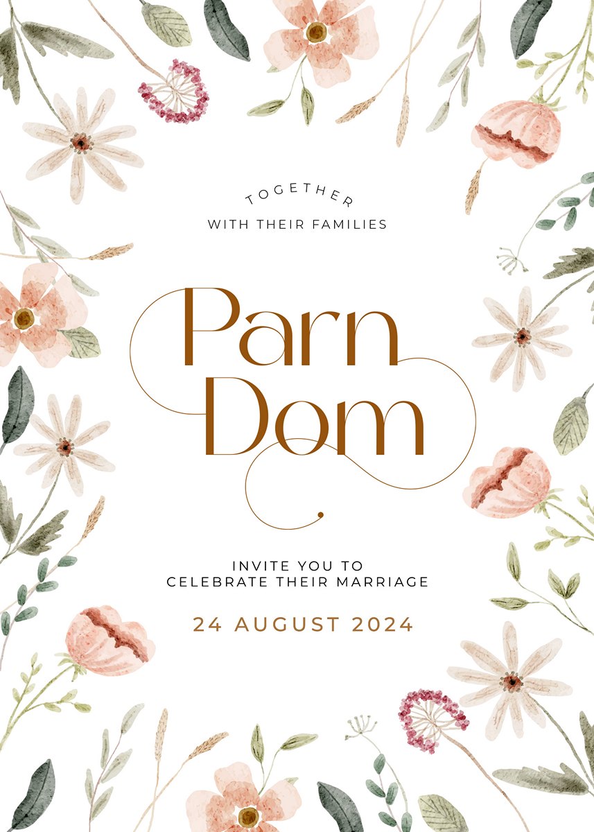 ตัวอย่างการ์ดแต่งงานจากร้าน Samadul Studio เราออกแบบตามความต้องการของลูกค้า โดยเน้นการจัดวางรูปแบบต่าง ๆ อย่างลงตัวที่สุดเพราะเราทราบว่าทุก ๆ อย่างที่ปรากฎบนการ์ดของคุณมีความสำคัญเสมอ เราจึงใสใจในทุก ๆ รายละเอียด เพื่อให้คุณส่งการ์ดเชิญที่สวยงามและสมบูรณ์แบบที่สุดไปยังผู้มีเกียรติทุกท่าน